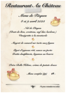 Pour vos banquets, vos repas d’affaires ou réunions de famille, la salle à manger du Château vous séduira par son charme discret et la qualité des plats que l’on vous y propose. Toute l’intimité d’une salle à manger de 38 places. C’est ce que vous propose le restaurant du Château.